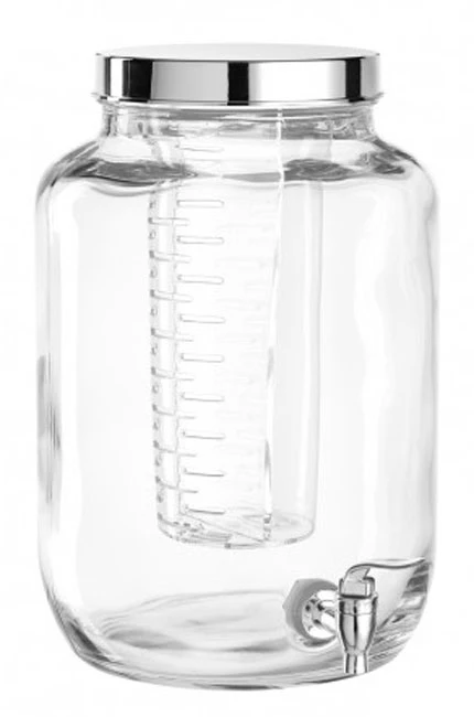Der Getränkespender hat ein Fassungsvermögen von 7 Liter. Der Einsatz in der Mitte kann mit Früchten und/ oder Eiswürfel befüllt werden.
